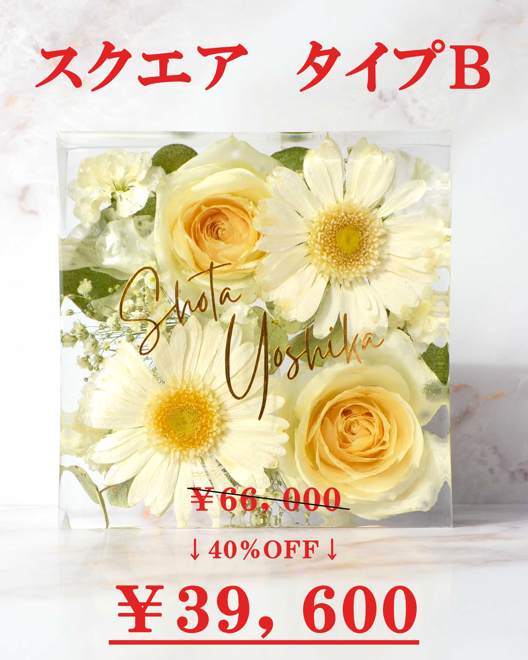 新商品発売記念!モニターキャンペーン ※数量限定※ 全商品モニター価格 40% OFF!! 結婚式やプロポーズなど、一生に一度の大切な思い出を お花とともにレジンに閉じ込めてカタチに残しませんか? 応募条件 当店Instagramをフォローしていただける方 お花を頂いた際のエピソードや写真を提供していただける方(写真のお顔にはモザイク加工いたします) お手元に作品が届いた後に、ご自身のSNSで当店をタグ付けして投稿してくれる方(できればお願いします!) 制作事例として当店SNSやHPに掲載可能な方(文字入れの名前等もそのまま掲載させていただきます) ご希望の方は、当店の公式LINEからご連絡ください